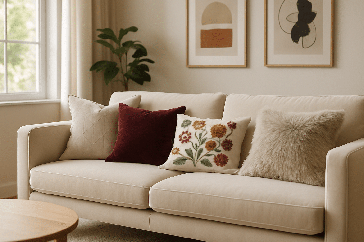 - Canapé beige : coussins bleus, verts ou aux motifs audacieux pour créer du contraste.